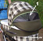 Возможность открыть часть капюшона коляски (на рисунке обозначено стрелкой и цифрой 1)